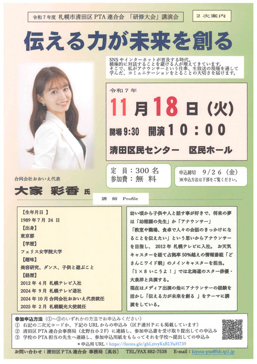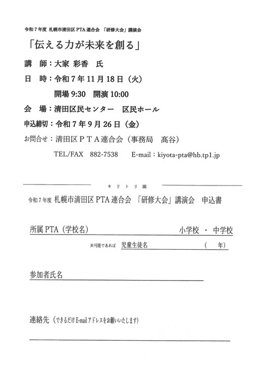 ② 清田区PTA連合会事務局(北野台小2F)に連絡し、参加申込書を受け取り提出しての申込み